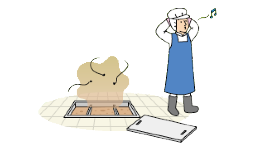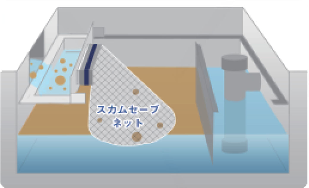 スカムセーブネットが細かい残渣まで収集し生ゴミを水中で溜めていく方式なので酸化が遅れ、水封されるためニオイは画期的に改善します。同時にネットが防護膜となり、衛生害虫の餌場への侵入を防ぎます。